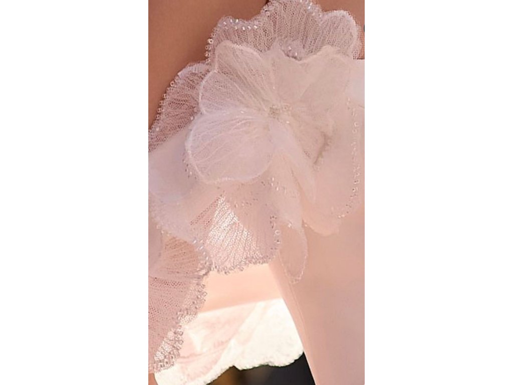 Rukávy: Spustené ramienka zdobené bohato vypracovanými 3D kvetmi z čipky – každý krok nevesty tak pôsobí ako rozkvitnutý detail.