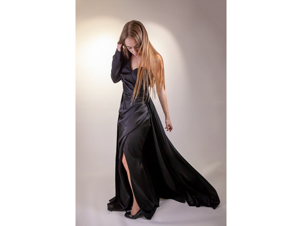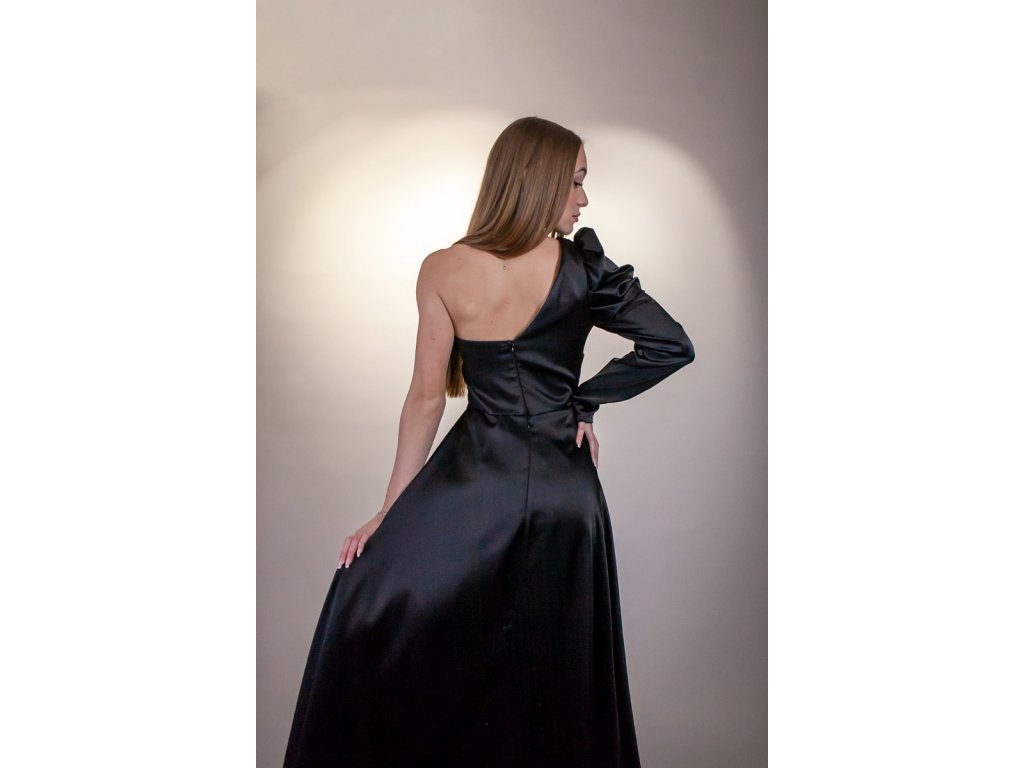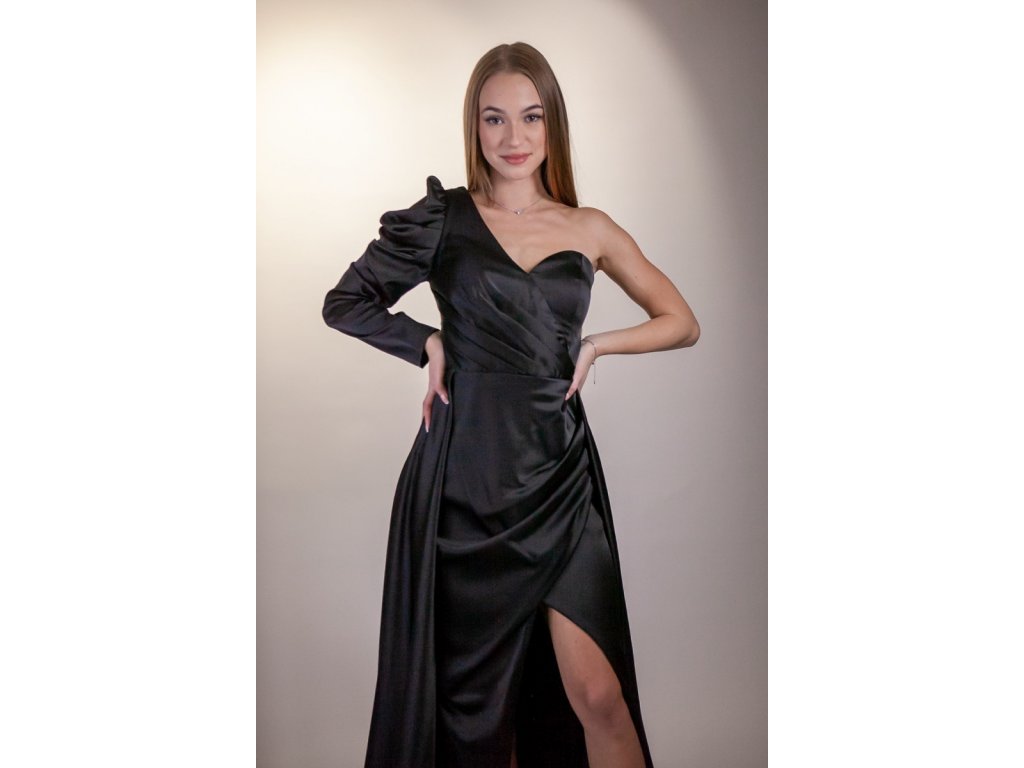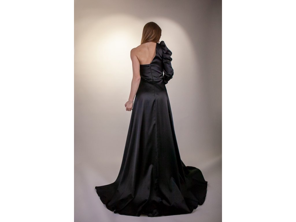Na tieto šaty si musíte trúfať pretože z nich doslova sála dôležitosť a dramatickosť. Určite to nebude pre každého. Šaty sú saténové a sú čierne. Samá daná čierna farba nám už niečo napovedá o dôstojnosti a elegantnosti. Tie dramatické prvky nájdeme na týchto šatách rovno dva! Ale poďme si tieto šaty prejsť celé.... Šaty sú vlastne na jedno rameno. Jedna ruka sa kompletne skrýva pod pompéznym rukávom. Za to, tá druhá strana je úplne odhalená. Tento zaujímavý vrch prechádza do sukne, ktorá nie je len takou obyčajnou sukňou. Spodná sukňa má dokonca aj rozparok. Od pása vychádza ale ešte aj vrchná časť sukne ktorá je akýmsi plášťom spodnej sukne a vytvára akúsi vlečku. Na zadnej strane sa nachádza samostatný zips na každú sukňu. Šaty sú vhodné na naozaj dôležité udalosti, určite sa hodia aj dôležitý ples.