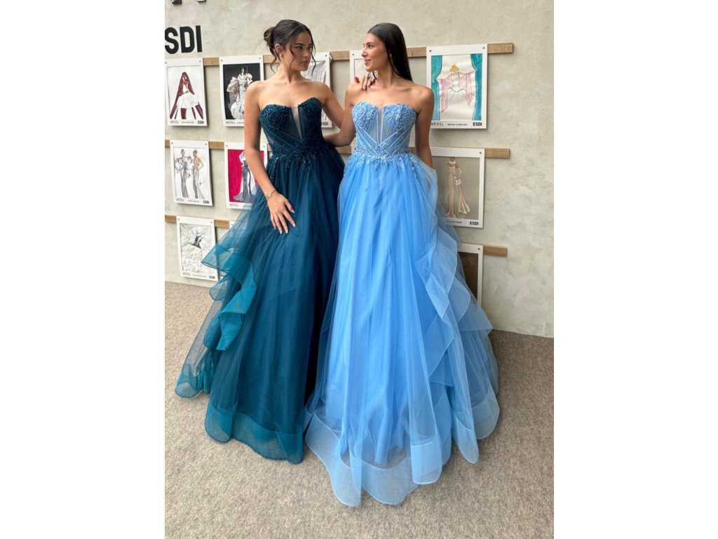 Romantické tylové šaty s korzetovým živôtikom v petrolejovej a svetlomodrej farbe.