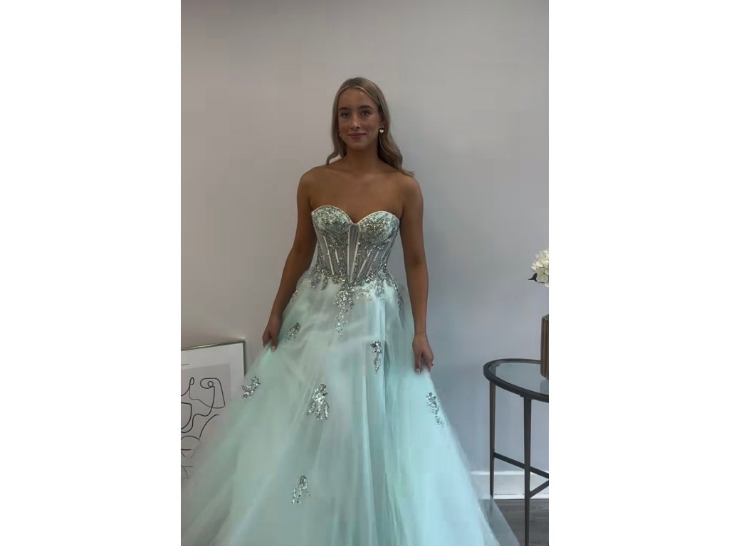 Tieto nádherné spoločenské šaty v jemnej mentolovo zelenej farbe sú stelesnením elegancie a moderného štýlu. Vrchný korzetový diel je bohato zdobený trblietavými kamienkami a aplikáciami, ktoré krásne zvýrazňujú postavu. Transparentné línie v živôtiku dodávajú modelu zmyselnosť, zatiaľ čo nadýchaná tylová sukňa s rozparkom pôsobí ľahko a vzdušne. Ideálna voľba na stužkovú, ples alebo slávnostnú udalosť, kde chcete zažiariť a pritiahnuť všetky pohľady.