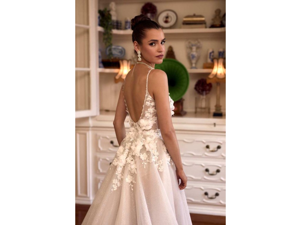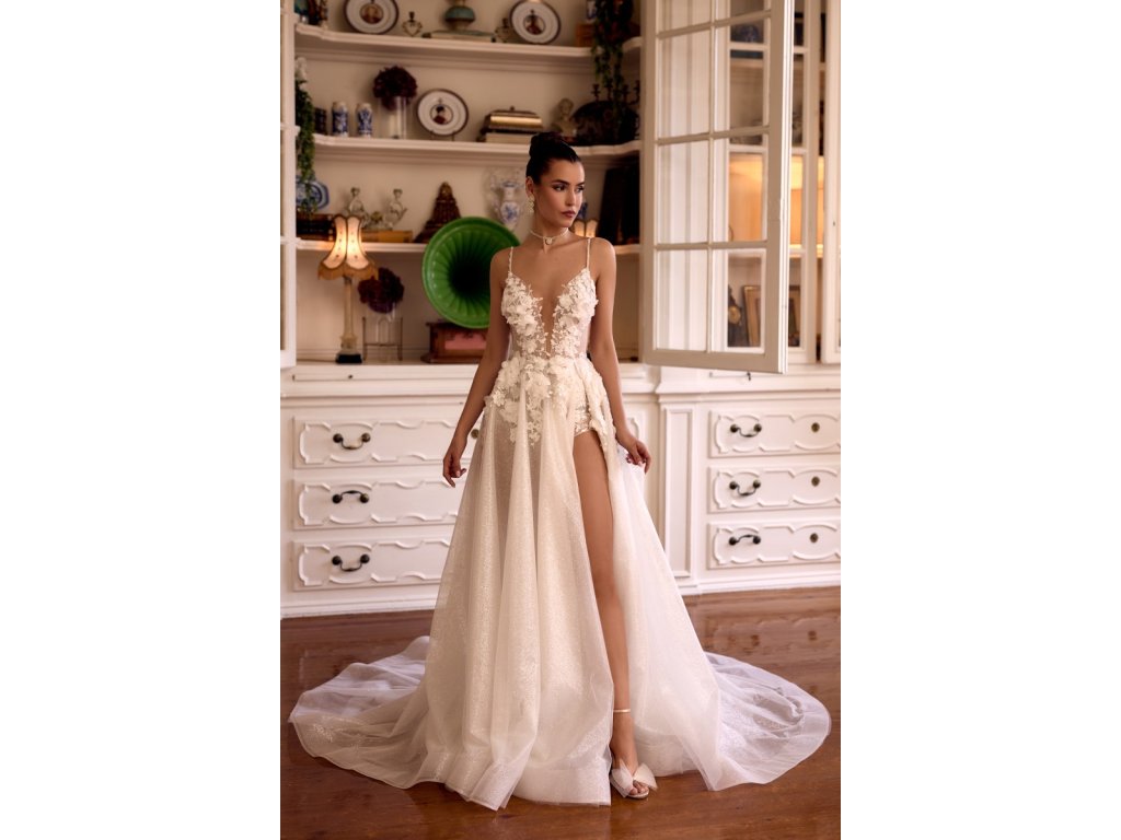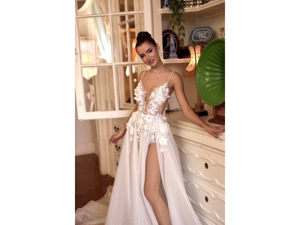 Tento model vyniká hlbokým výstrihom s jemnými ramienkami a transparentnými detailmi, ktoré sú zdobené aplikáciami kvetov. Bohatá tylová sukňa s rozparkom dodáva šatám ľahkosť a zmyselnosť, zatiaľ čo 3D kvetinové prvky na živôtiku a v páse vytvárajú nezameniteľný, moderný look.