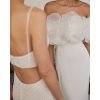 Model Tayden, od značky Rosa Clara, je zosobnením minimalistickej sofistikovanosti s nádychom romantiky. Táto úchvatná svadobná róba s hladkou siluetou nádherne obopína postavu a jej off-shoulder rukávy s dramatickými 3D kvetmi dodávajú neodolateľnú jemnosť a šarm.